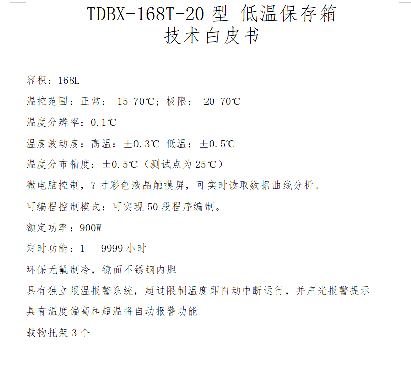 TDBX-168T-20型 低溫保存箱 技術白皮書 容積:168L 溫控范圍:正常:-15-70℃;極限:-20-70℃ 溫度分辨率:0.1℃ 溫度波動度:高溫:±0.3℃ 低溫:±0.5℃ 溫度分布精度:±0.5℃(測試點為25℃) 微電腦控制,7寸彩色液晶觸摸屏,可實時讀取數據曲線分析。 可編程控制模式:可實現50段程序編制。 額定功率:900W 定時功能:1- 9999小時 環保無氟制冷,鏡面不銹鋼內膽 具有獨立限溫報警系統,超過限制溫度即自動中斷運行,并聲光報警提示 具有溫度偏高和超溫將自動報警功能 載物托架3個 優點 安全性